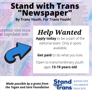 The project will provide leadership opportunities, the ability to hone your skills in writing, art, digital publishing and organization. The group will produce three editions over the course of the grant. The newspaper will be published on standwithtrans.org and shared on our social media channels.
