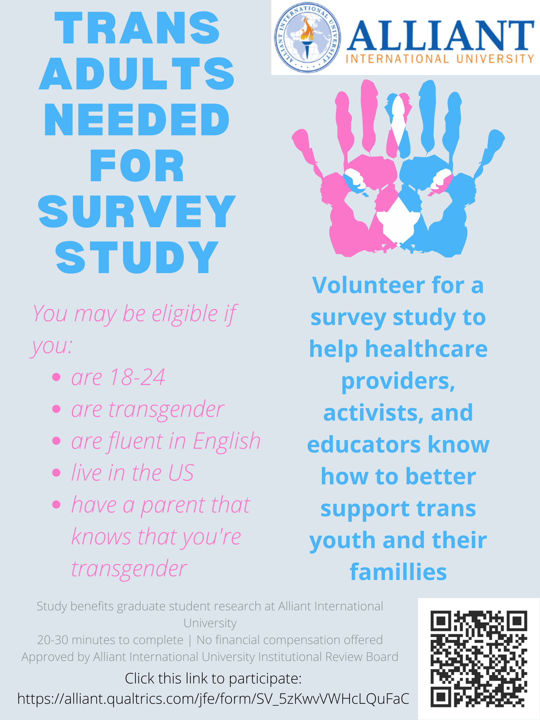 I am a graduate student at Alliant International University in the San Francisco Bay Area, in the Clinical Psychology Program. If you are a transgender adult between the ages of 18 and 24 living in the U.S. and you have a parent who knows that you are transgender, I invite you to take part in my research study. This form has important information about the reason for doing this study and, if you choose to participate, what your role would be, and how I would like to use your answers: